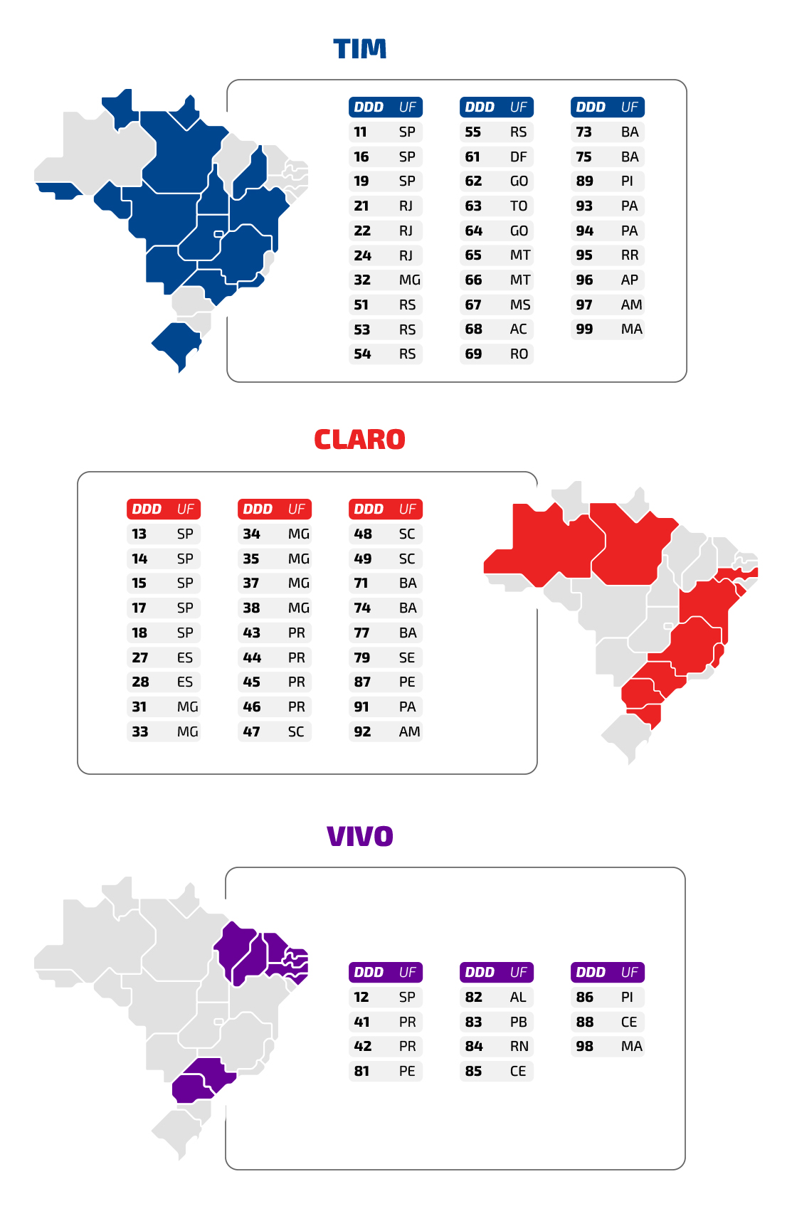 Desta forma, a Claro teve 27 DDDs, A Vivo ficou com 11 DDDs e a TIM obteve 29 DDDs.
